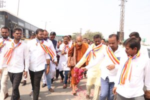 The arrival of the monks and pilgrims in Patancheru was marked by a grand welcome organized by the Patancheru Ambedkar Youth Association. Participants received the monks with flower garlands, resonating chants of “Jai Bhim,” and Buddhist devotional songs, creating a vibrant and respectful atmosphere.