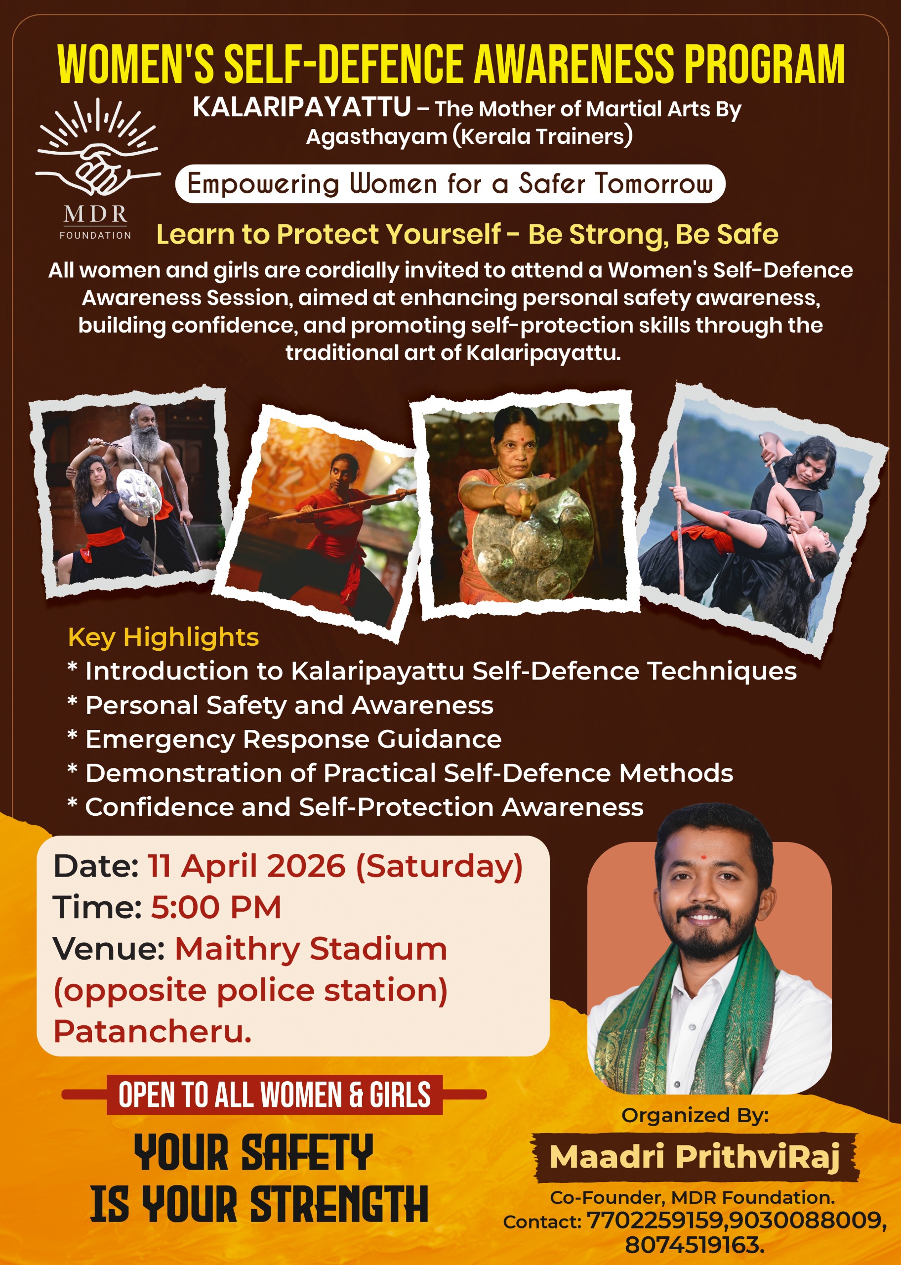 Join us for an empowering session on Kalaripayattu, the mother of all martial arts. This program is dedicated to enhancing personal safety, building confidence, and promoting self-protection skills for women and girls.